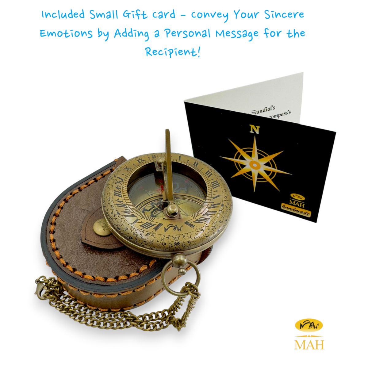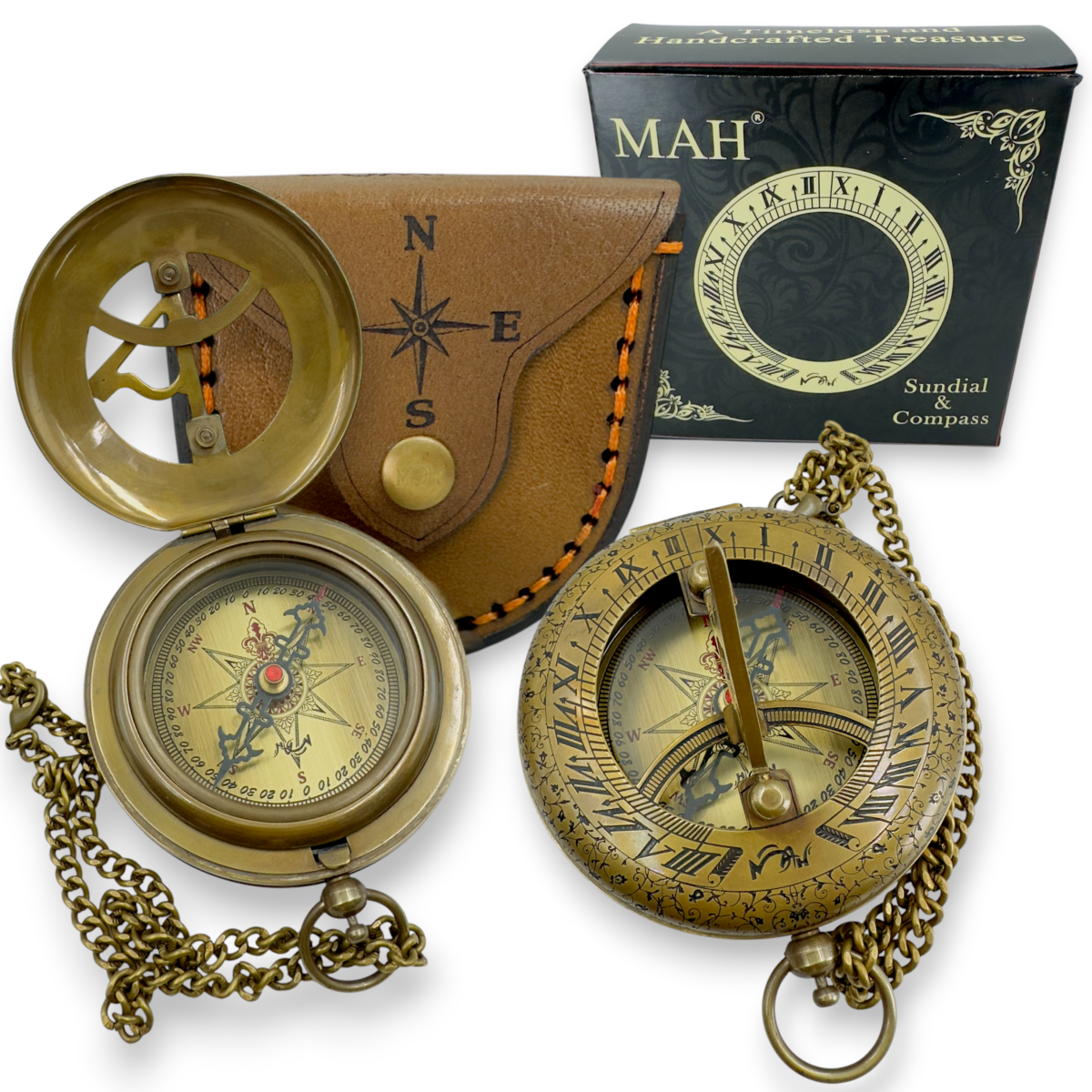 3 Inch Antique Brass Sundial Compass with Roman Numeral Dial – Vintage Nautical Pocket Compass with Chain & Hand-Stitched Leather Case, Classic Graduation Gift for Men, Collectors & Groomsmen