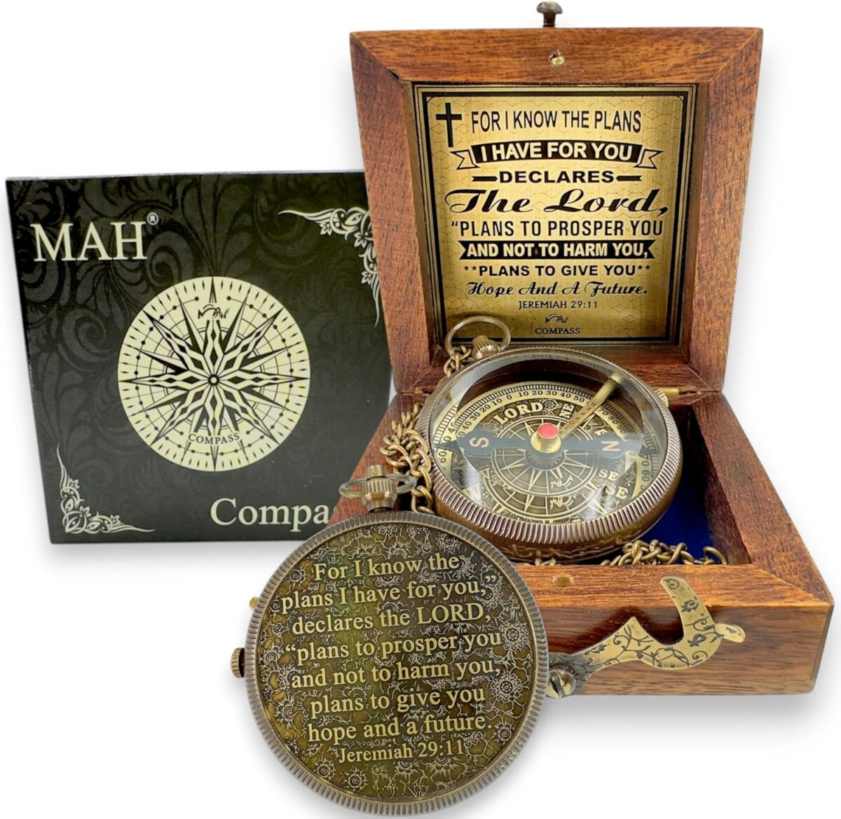 “For I know the plans I have for you,” declares the LORD, “plans to prosper you and not to harm you, plans to give you hope and a future.” – Jeremiah 29:11 This engraved brass compass is more than a navigational tool—it’s a symbol of faith, direction, and divine promise. The compass dial features “LORD” in place of North, serving as a powerful reminder that true guidance comes not from the world, but from God. Whether you’re honoring a graduation, baptism, confirmation, or personal milestone, this compass inspires the recipient to trust in the LORD’s purpose through every season of life. The embossed dial, antique brass finish, and pocket-sized design make it both meaningful and beautifully giftable. Packaged in your choice of a leather case or wooden box, it’s a timeless keepsake for Christian teens, adults, and anyone starting a new journey with faith at the center.