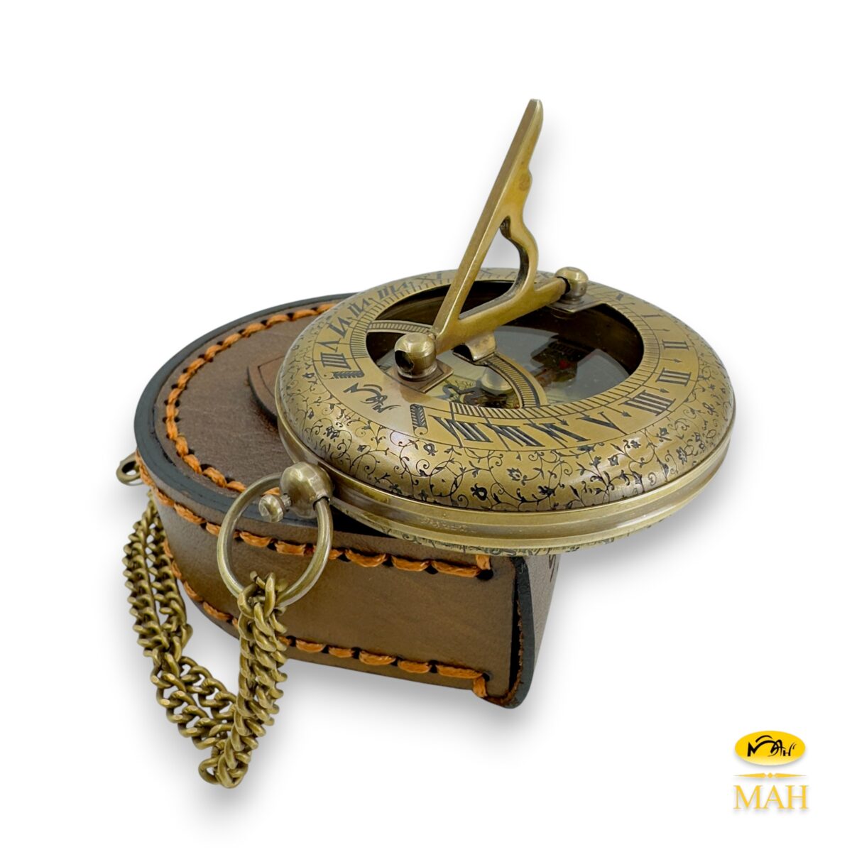3 Inch Decorative Antique Brass Sundial Compass with Roman Numeral Dial – Vintage Nautical Pocket Style Gift with Chain & Hand-Stitched Leather Case, Graduation Gift for Men & Collectors