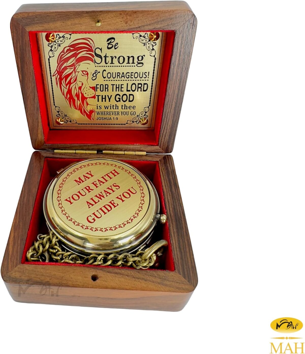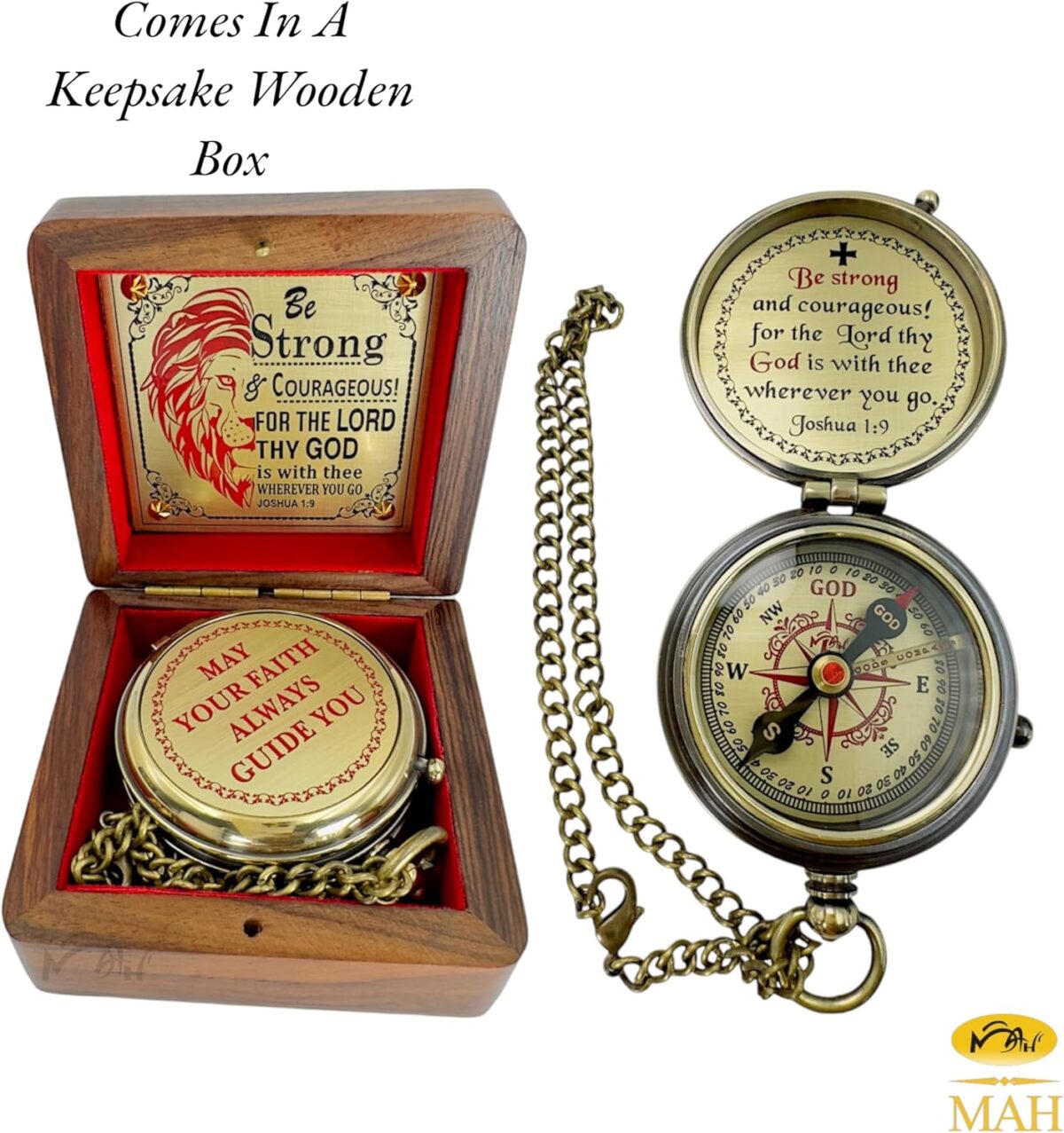 MAH Be Strong and Courageous Brass Religious Compass Gift Confirmation Baptism Easter Christian Catholic Graduation Trekking Adventure Engraved Scripture Prayer Gift for Men Women Teenage Boys Girls