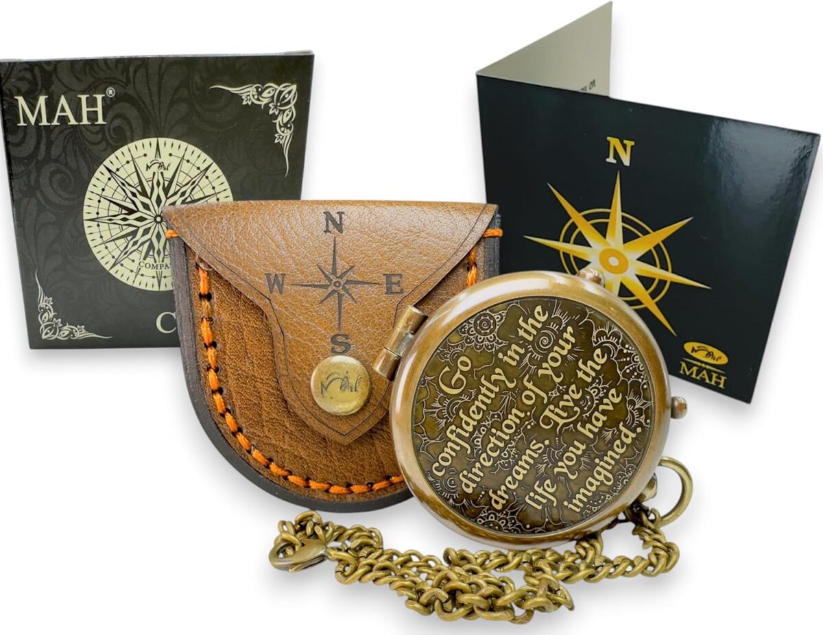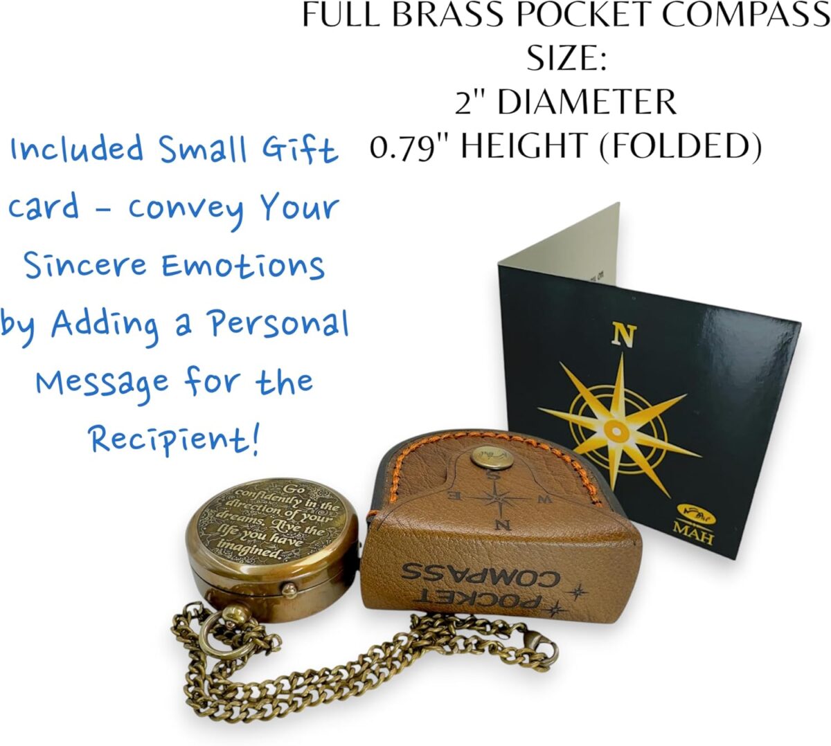 This handcrafted flat compass is more than a navigation tool—it’s a meaningful reminder to move forward with confidence. The back carries Henry David Thoreau’s enduring words: “Go Confidently in the Direction of Your Dreams. Live the Life You Have Imagined.” Made from antique-finished brass with a beveled glass dial and needle lock mechanism, this unique flat compass offers precision and durability in a sleek design. Its smooth round back and pocket-watch style chain make it easy to carry, while the hand-stitched belt leather case (engraved with a compass design) adds both practicality and artisanal charm. Presented with a greeting card for your personal message, this compass is the perfect graduation, confirmation, or milestone gift—a keepsake that inspires dreamers to follow their true north.