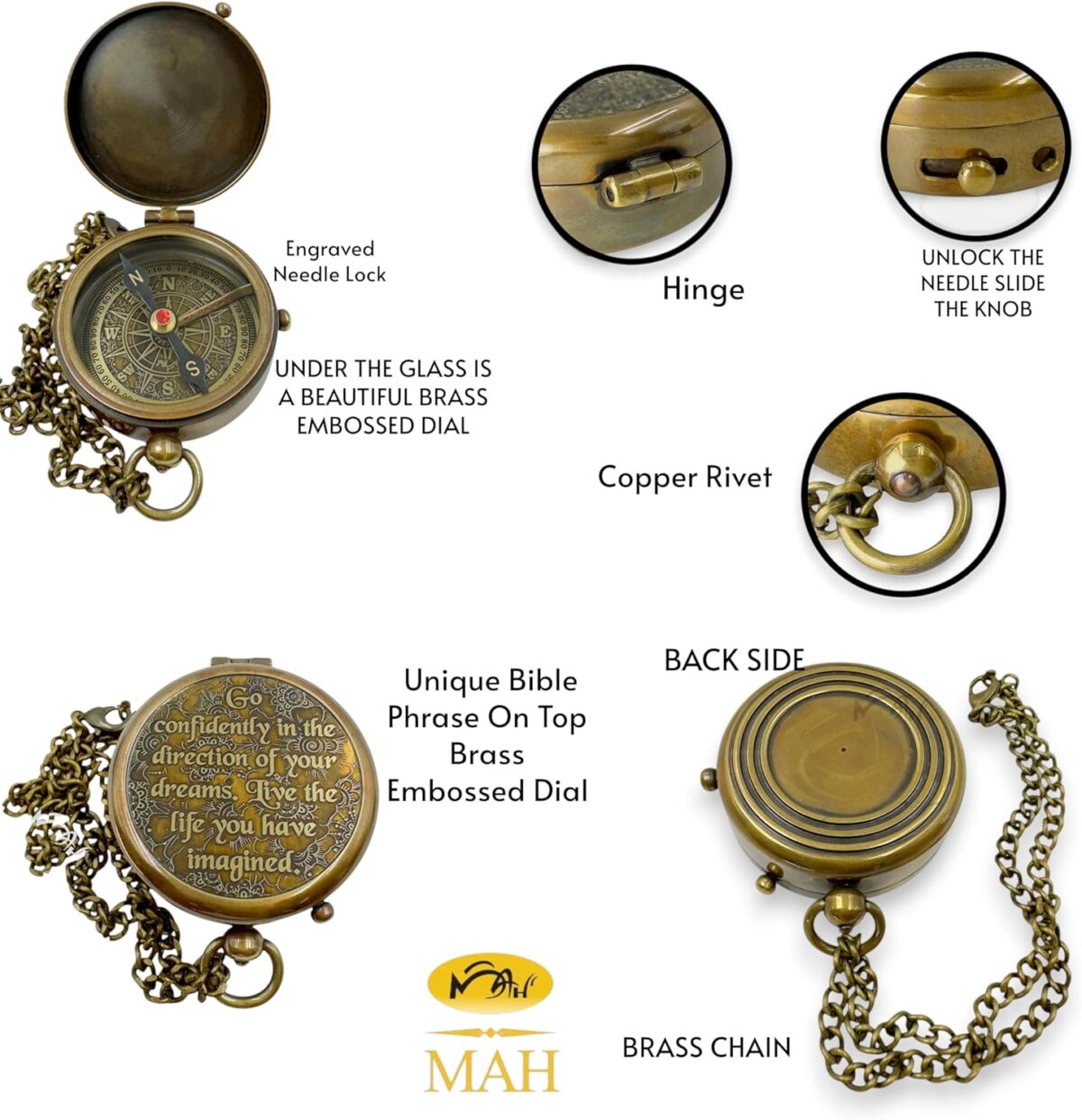 🧭 Embossed Brass Dial Inside – Beneath the beveled glass, the compass features a detailed brass dial design, crafted in antique finish for an elegant, artisanal look.