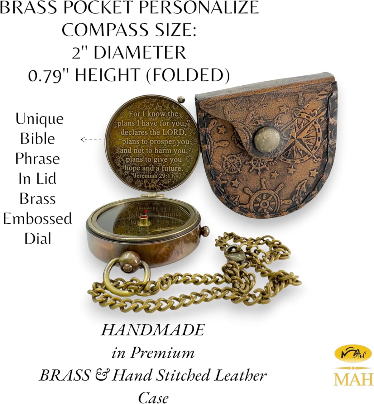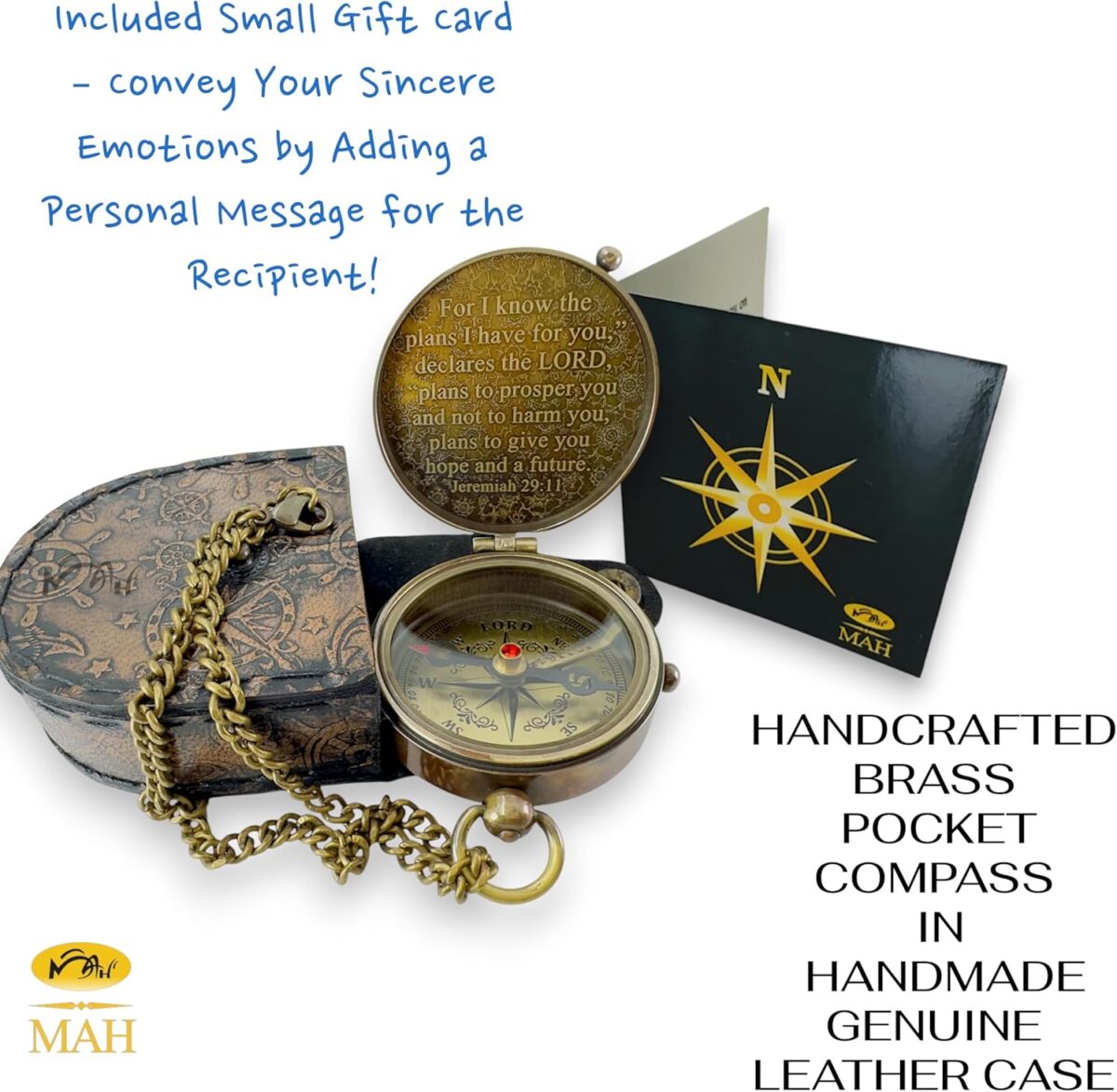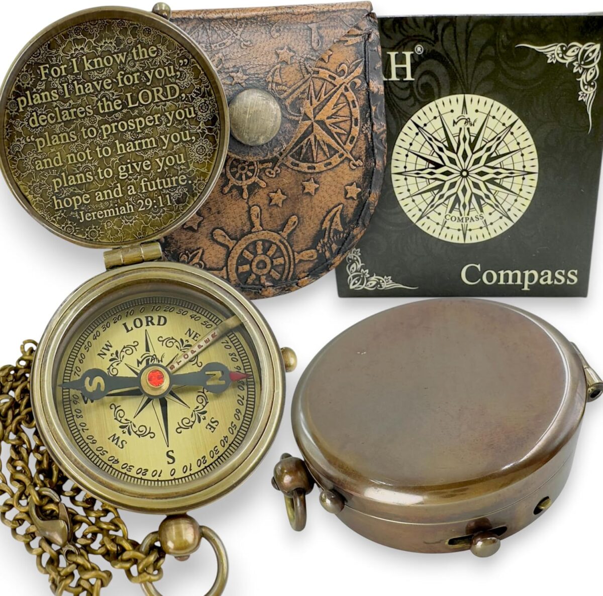“For I know the plans I have for you,” declares the LORD, “plans to prosper you and not to harm you, plans to give you hope and a future.” – Jeremiah 29:11 This engraved brass compass is more than a navigational tool—it’s a symbol of faith, direction, and divine promise. The compass dial features “LORD” in place of North, serving as a powerful reminder that true guidance comes not from the world, but from God. Whether you’re honoring a graduation, baptism, confirmation, or personal milestone, this compass inspires the recipient to trust in the LORD’s purpose through every season of life. The embossed dial, antique brass finish, and pocket-sized design make it both meaningful and beautifully giftable. Packaged in your choice of a leather case or wooden box, it’s a timeless keepsake for Christian teens, adults, and anyone starting a new journey with faith at the center.