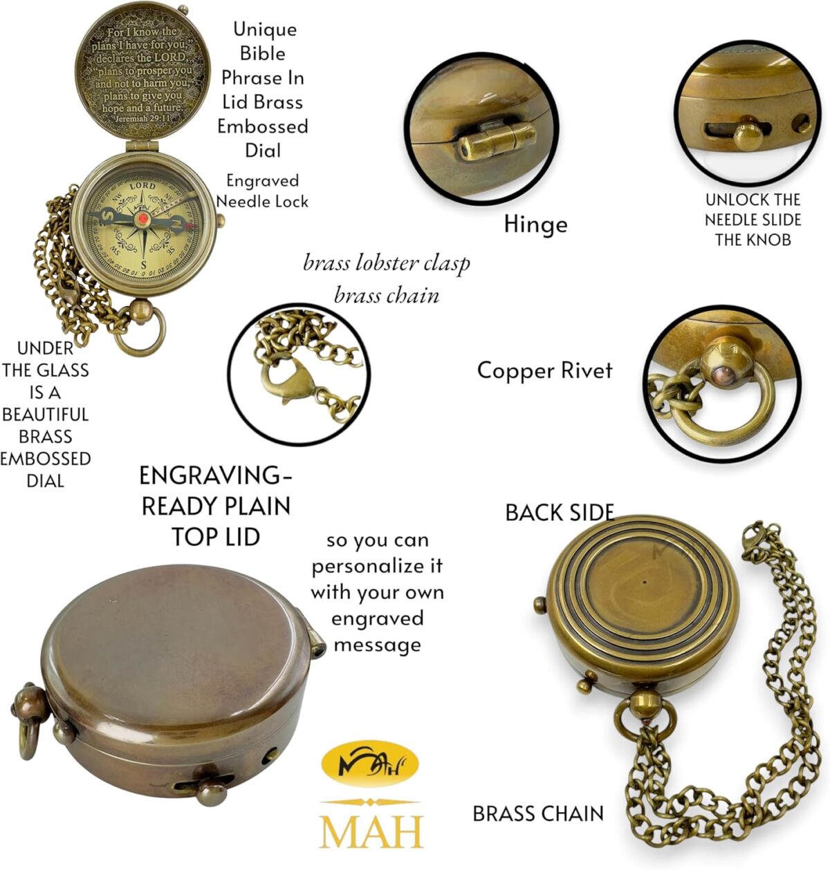 For I Know the Plans – Jeremiah 29:11 Brass Compass with Embossed Dial & “LORD” as North, Christian Gift for Graduation, Baptism, Confirmation, Pocket Keepsake for Boys, Girls, Adults, Religious gifts