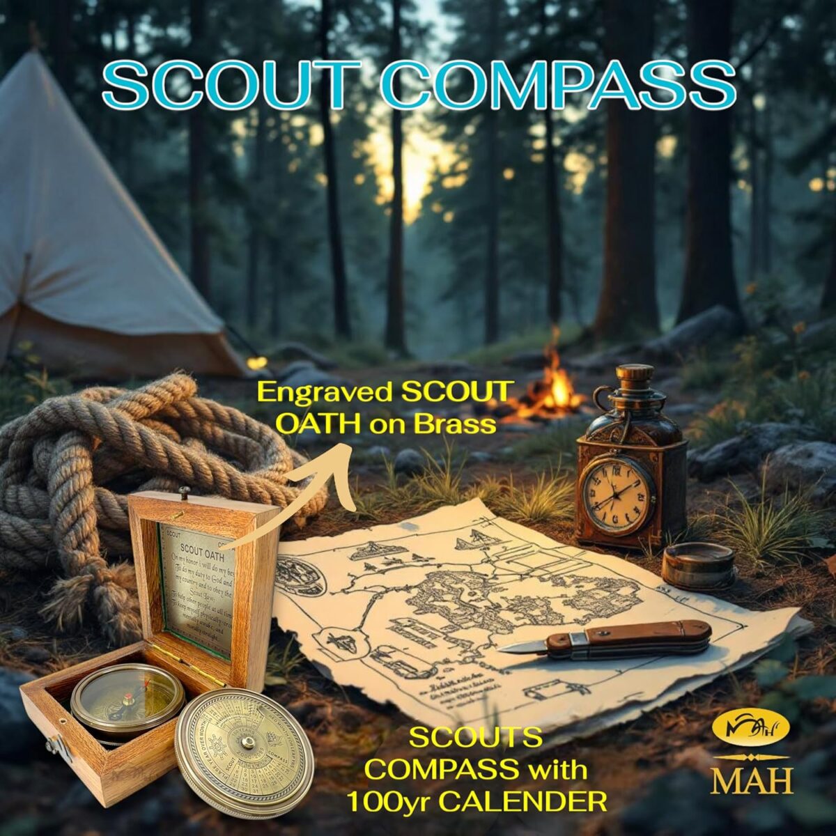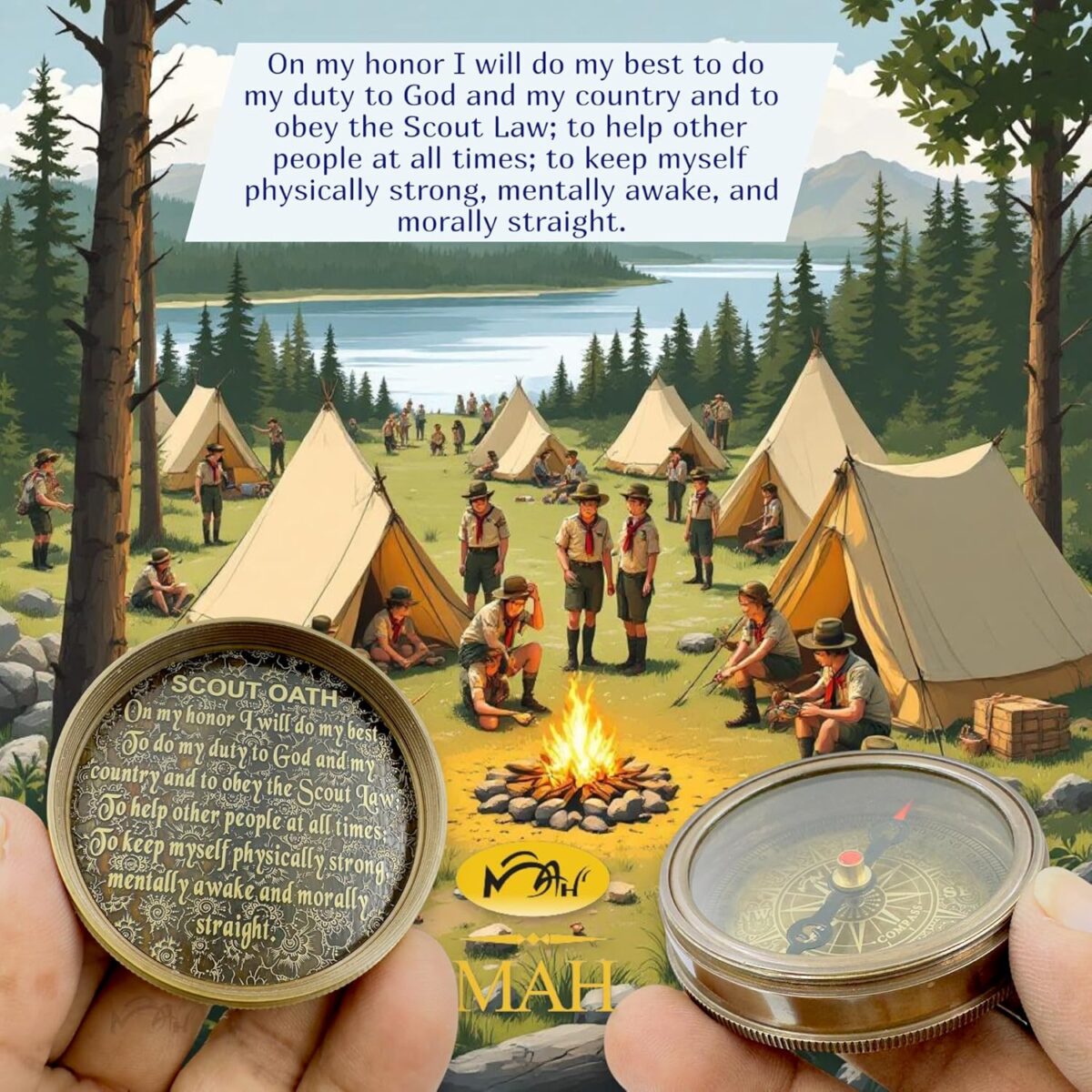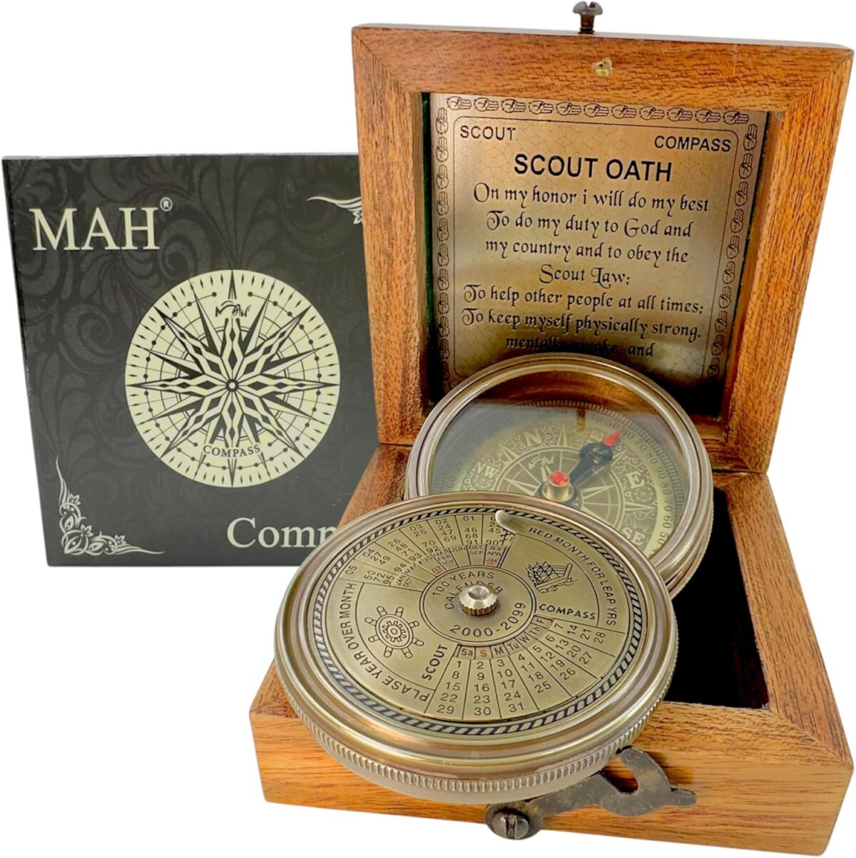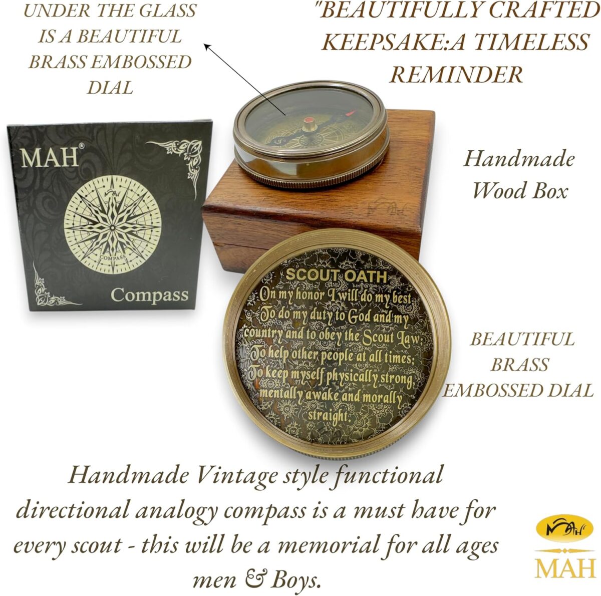 - 🧭 Scout Oath on Lid and Box – Dual Reminder of Duty – The full Scout Oath is embossed on the compass lid and engraved on a brass plaque inside the box—symbolizing honor, strength, and commitment.