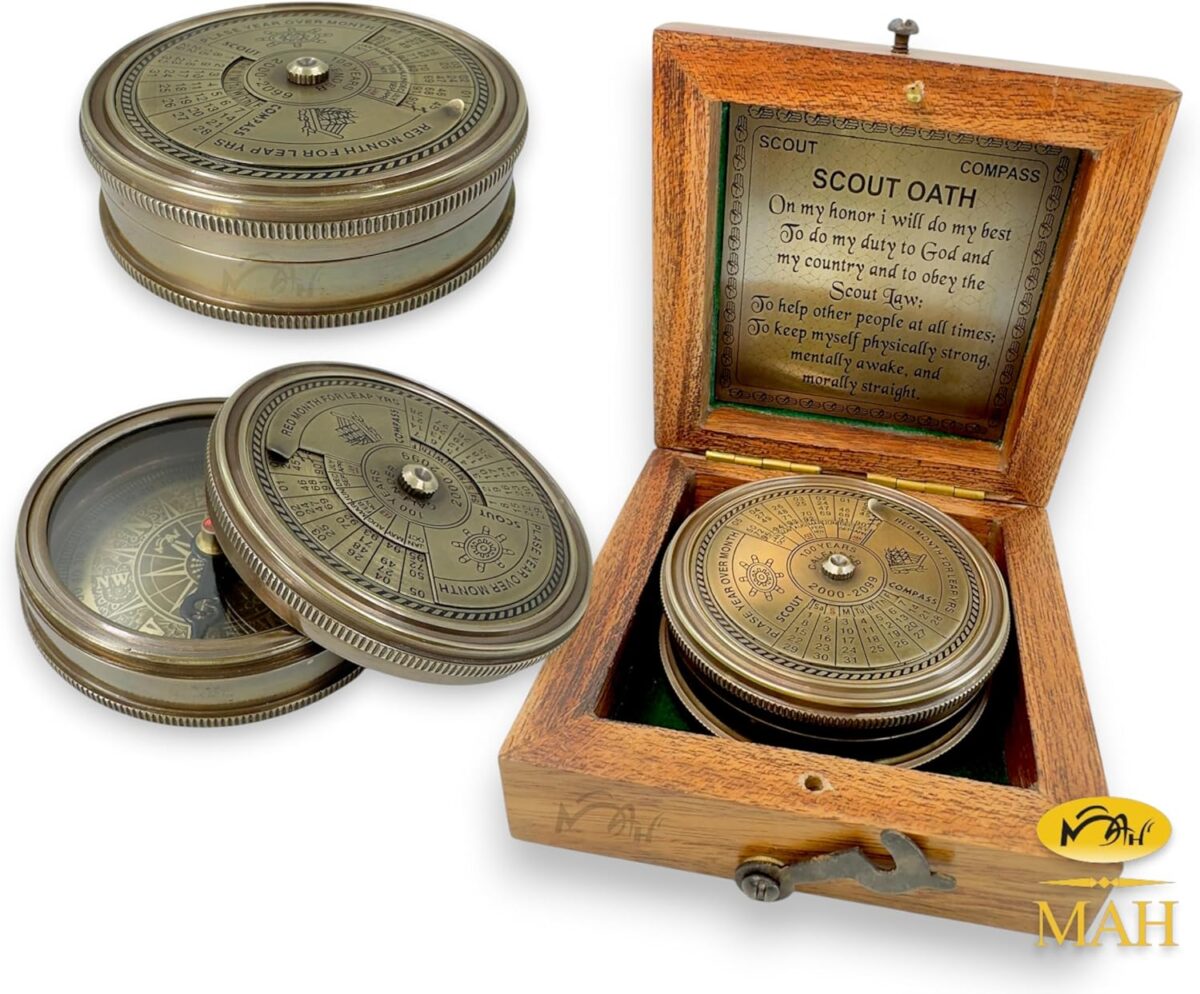 This handcrafted brass compass is more than just a navigation tool—it’s a time-honoring keepsake for those who live by the Scout Oath. The dial includes a 100-year calendar (2000–2099), historically used to calculate weekdays, leap years, and align planning for future events—just like scouts prepare ahead. It’s a nod to the wisdom of planning and the passage of time. The full Scout Oath is beautifully embossed on the compass lid, while the inside of the wooden keepsake box features a mounted brass plaque with the same Oath engraved—making this a meaningful piece for display and direction. With a functional needle stopper, beveled glass dial, and included message card for your personal note, it’s the perfect gift for Eagle ceremonies, scout promotions, or milestone moments. This edition helps scouts track time, hold values, and never lose their way.
