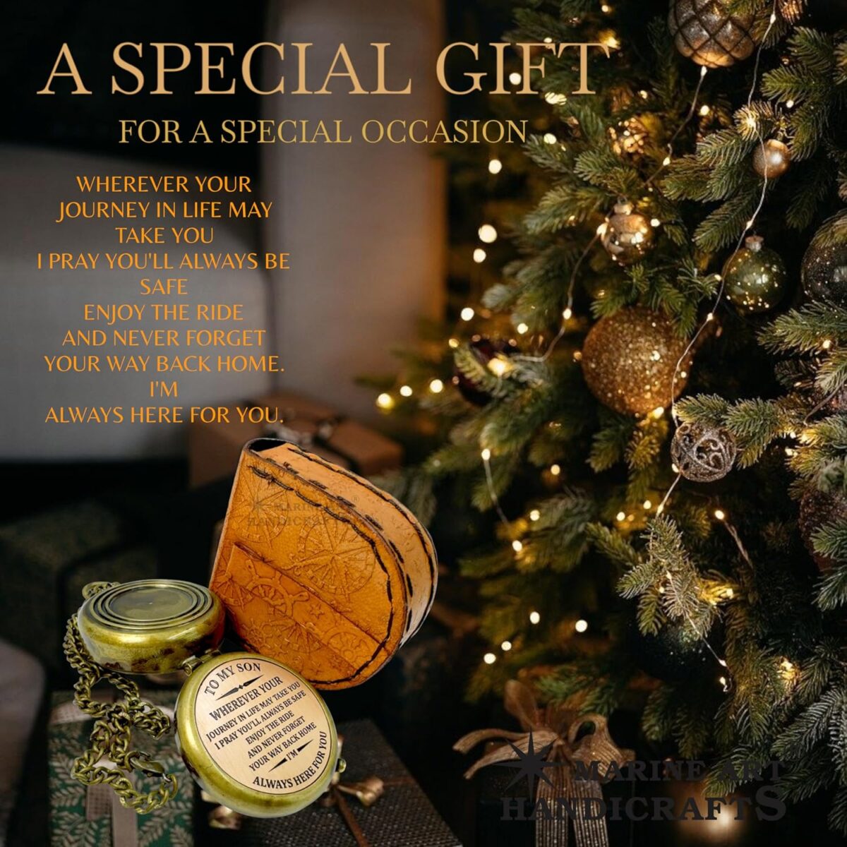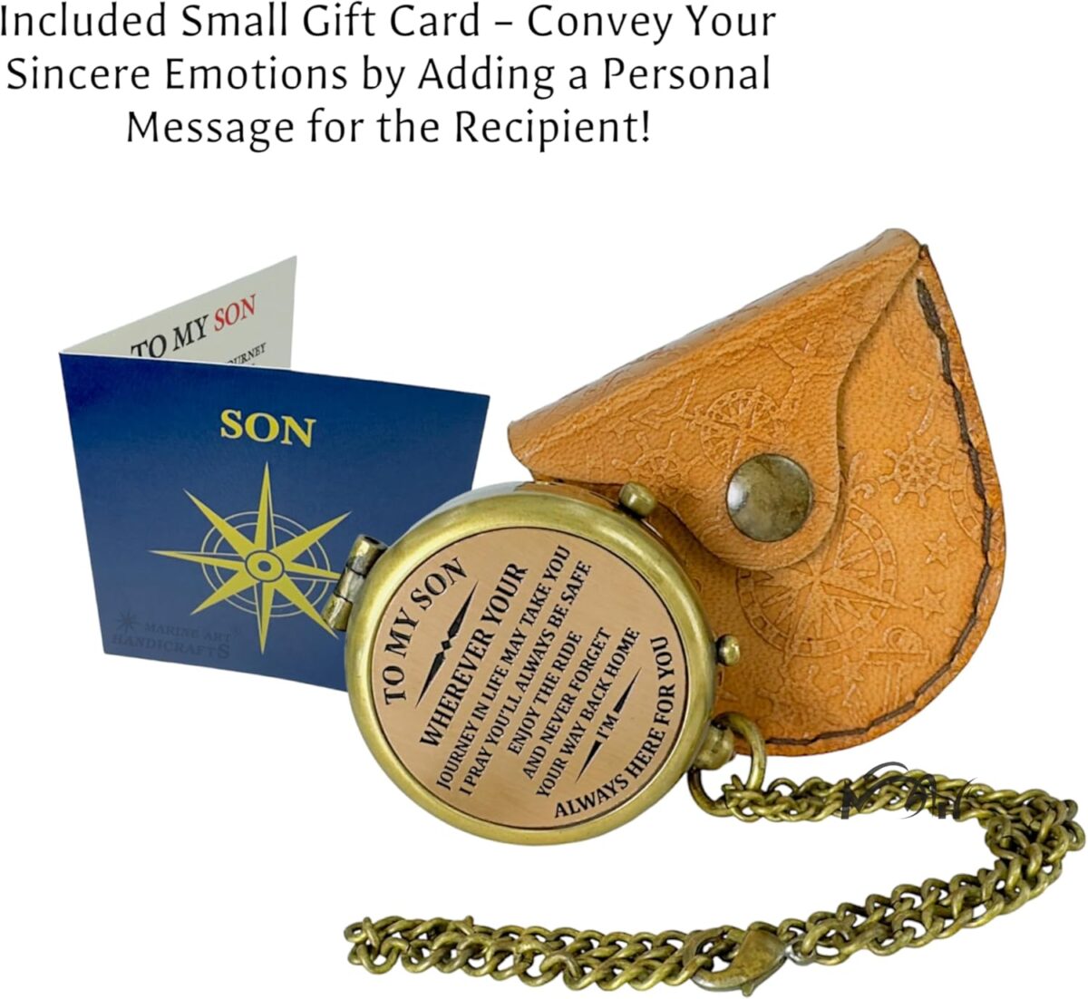 Give a gift that speaks from the heart. This beautifully crafted brass compass engraved with the heartfelt words “To My Son – Wherever your journey in life may take you, I’m always here for you” is more than just a keepsake — it’s a constant reminder of love, strength, and direction. Whether it’s graduation, baptism, confirmation, communion, or a birthday, this timeless piece makes every milestone truly special. Each compass is hand-finished with an antique brass look, giving it a classic, heirloom feel that never goes out of style. It features a smooth opening lid, a clear directional dial, and a removable brass chain that makes it easy to carry or display. The engraved leather case, with its intricate compass motif, elevates the presentation and makes it gift-ready right out of the box. This compass is a meaningful gift from Mom, Dad, Grandparents, Uncle, Aunt, or any loved one who wants to give a blessing that lasts. It’s perfect for sons stepping into new chapters — a reminder to stay strong, keep faith, and always find their way back home. Make your son’s special day unforgettable with a keepsake he’ll treasure forever.